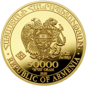 The coin´s obverse of this exclusive coin edition depicts the Armenian Coat of Arms. Underneath is the face value of the coin in Armenian Dram, the fineness, the weight and the year of issue of the coin, next to the symbol of the mint.The lettering the „Republic of Armenia” in Armenian and English language surrounds the ensemble.